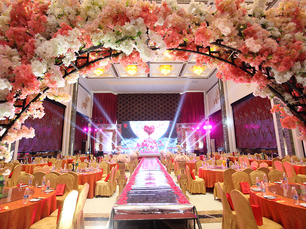 观澜国际名堂大气,特殊适合举行盛大的婚宴。四个婚宴大厅天天最多可承接200桌喜宴;